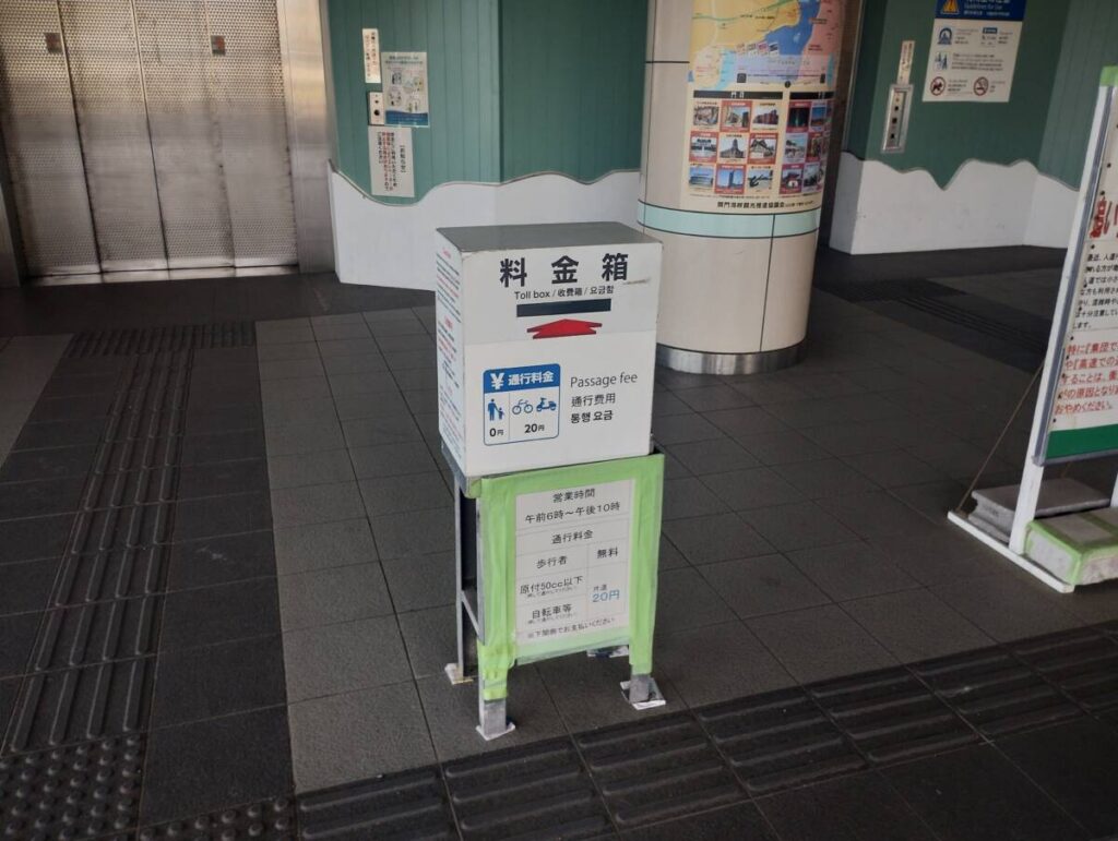 入り口の前には、通行料を回収するための料金箱が設置されています。通行料は「人」は無料ですが、自転車、バイクは 20円です。