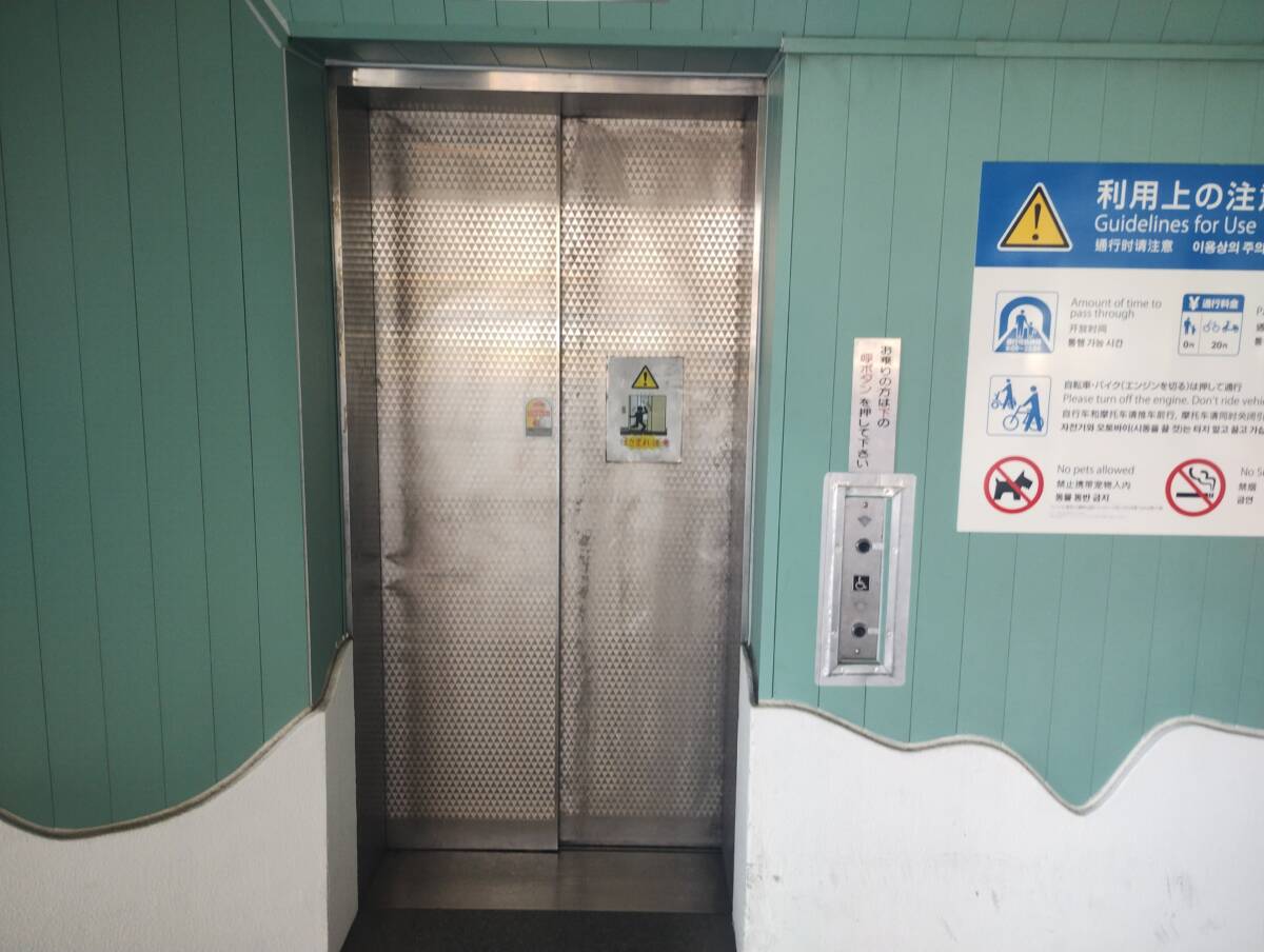 料金箱の後ろにには、トンネルへと続く大きなエレベーターがあります。このエレベーターに乗って地下のトンネルへと移動します。地上と地下の2つのボタンしかありませんが、地上から地下まで少し時間がかかります。それもそのはず、50m程地下に潜りますので…