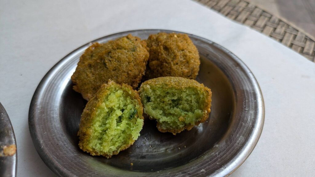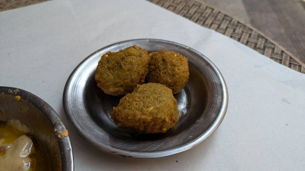 おかずは、小さな皿に3種類持ってきてくれました。その他にひよこ豆の唐揚げ、そして、ナン。ナンは食べ放題のようでした。
