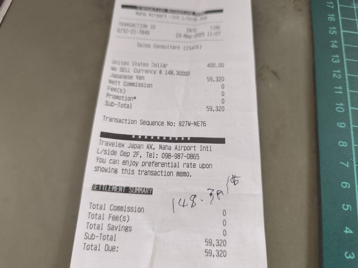 2025年5月23日に那覇空港内に唯一ある両替所 Travelex にて400ドルを 59,320 円で購入しました。