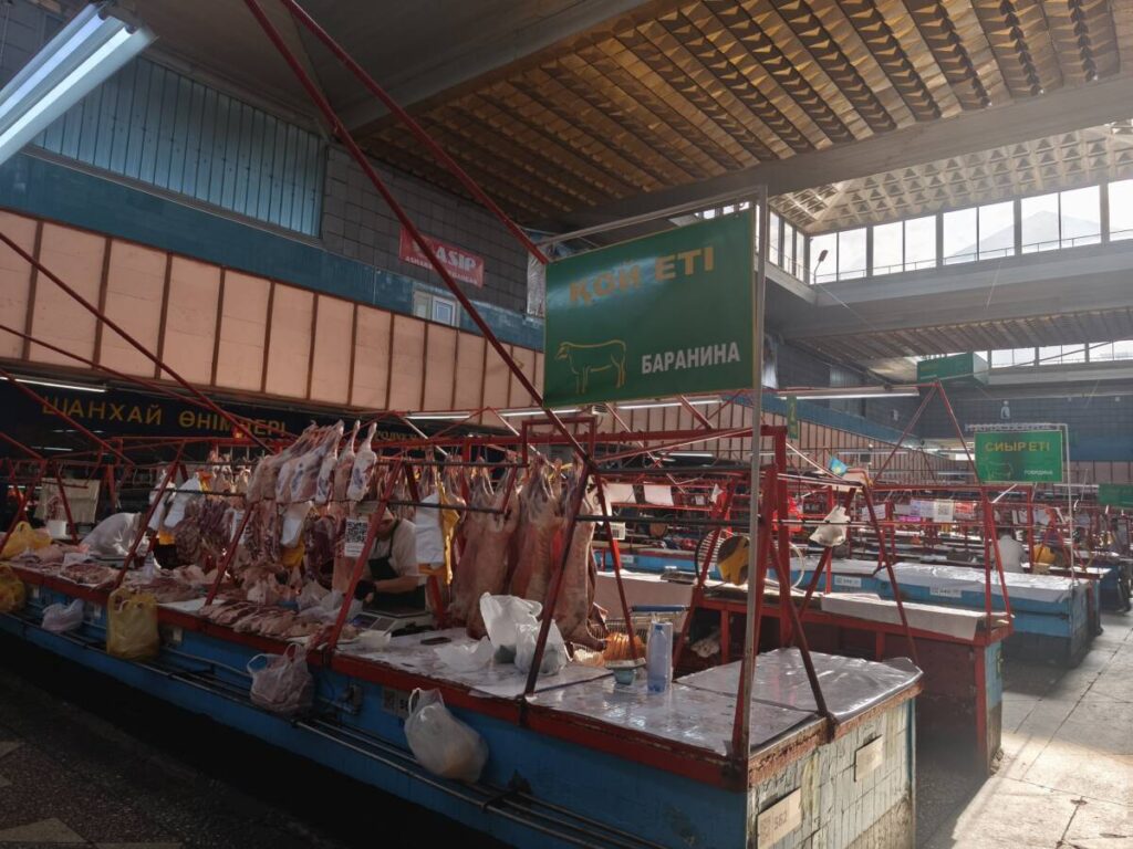 内部は販売する物ごとに、ゾーニングされており、上部に絵とカザフ語、ロシア語で販売品の表示が掲げられていました。通常9時ごろからの営業開始で、まだ準備も始めていない店舗がほとんどでした。