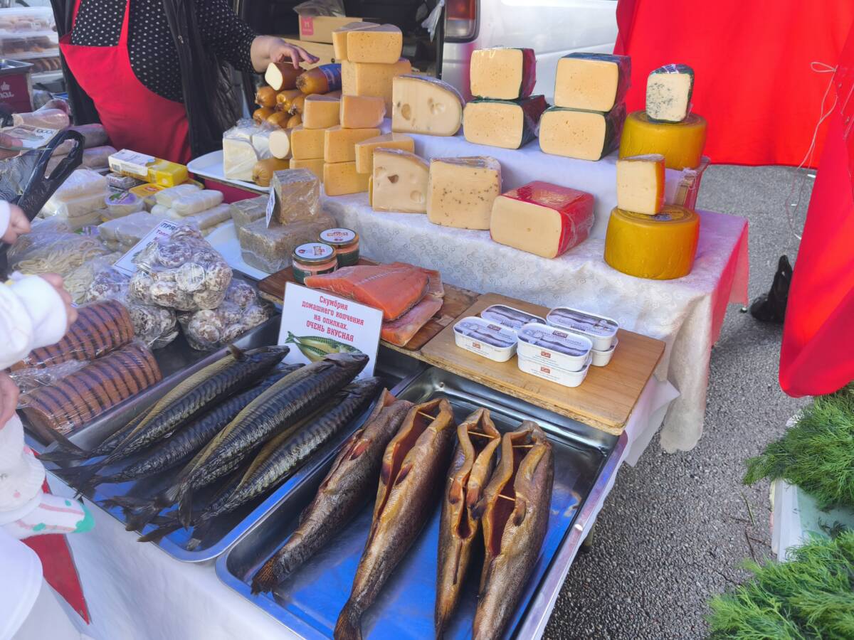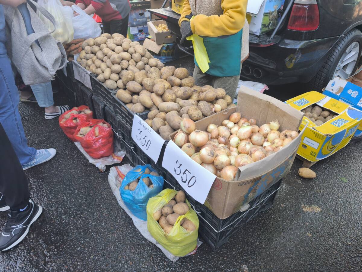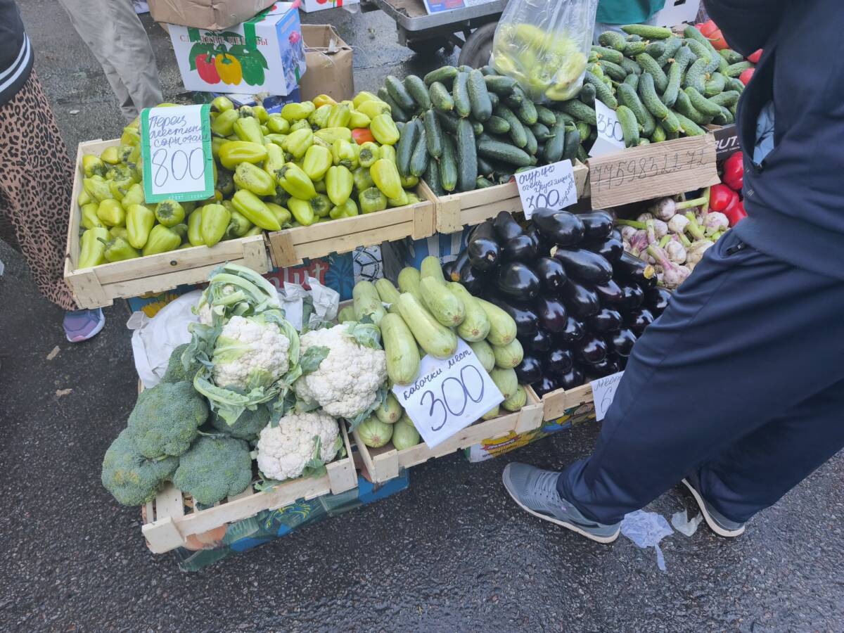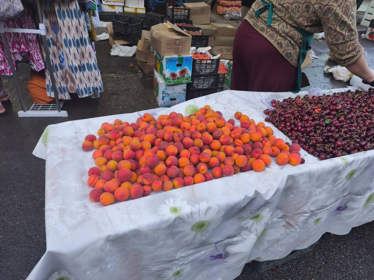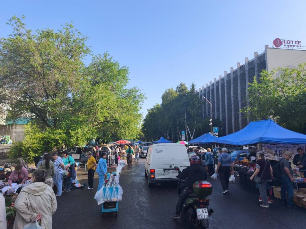 ゼレニ・バザールの隣の路地での青空市@アルマトイ カザフスタン X Facebook はてブ Pocket LINE コピー 2025.06.08 早朝7時頃にアルマトイで最も大きいという、ゼレニ・バザールを訪問しましたが、まだ、準備も始まっていないような状態でした。 バザールの建物を出て、道を少し歩くと、人がたくさん歩いているのが見れました。行ってみると、バザールに隣接する舗装道路を100m程使って、青空市が開かれていました。 チェリー、杏、いちご等の果物、玉ねぎ、じゃがいも、ニンジン、カリフラワー、ナスなどの野菜やハーブ類、円形の大きなパンであるナン、チーズ、魚の干物など、食料品を中心の市場で、活気がありました。