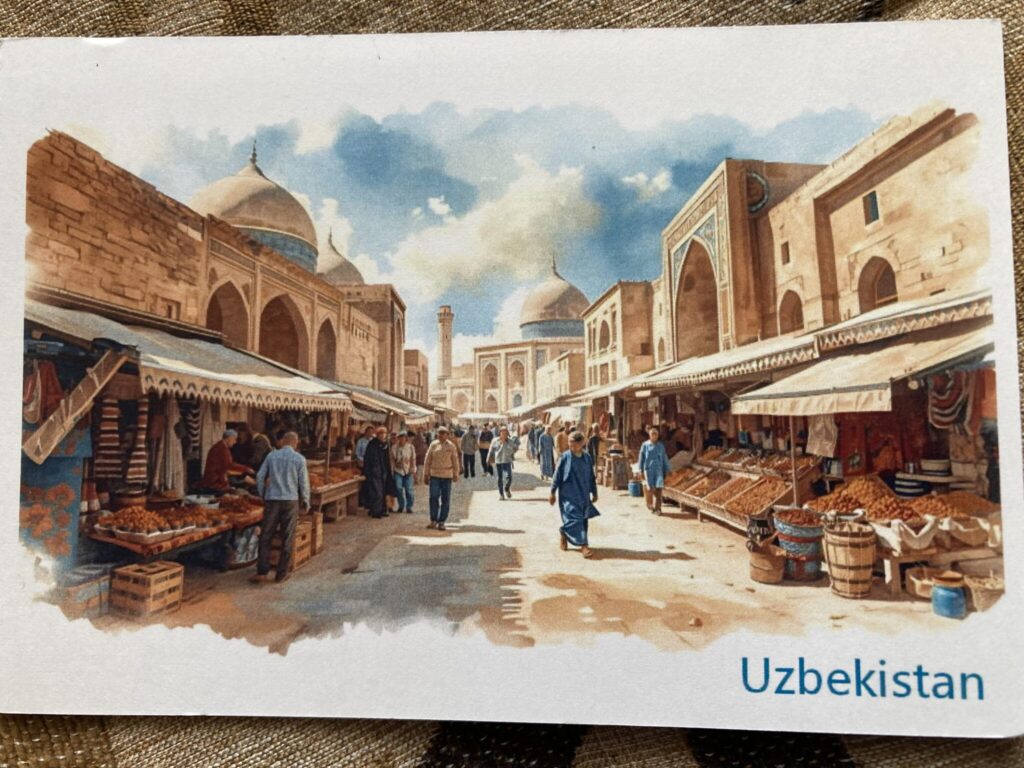 2025年9月にウズベキスタンへ行きました。タシケントから南東に位置するコーカンド(現地では コカン と呼ばれている)を訪問し、コーカンドの町の郵便局より、絵葉書を送りました。