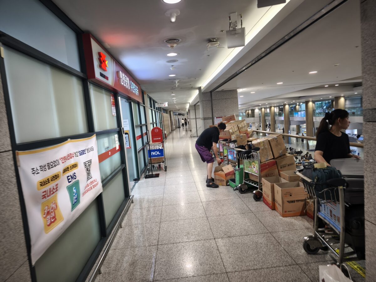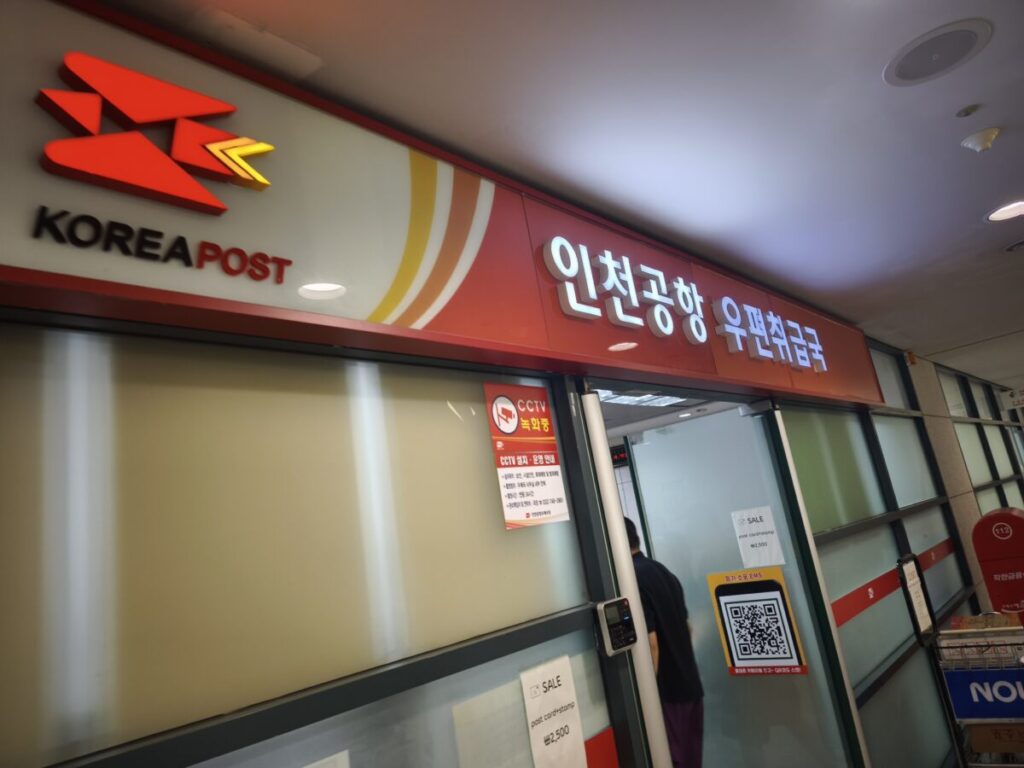 仁川国際空港第1ターミナルの郵便局は、1階・到着フロアーと3階・出発フロアーの間、2階に相当する場所にあります。ちょうど、Hana銀行の隣になります。