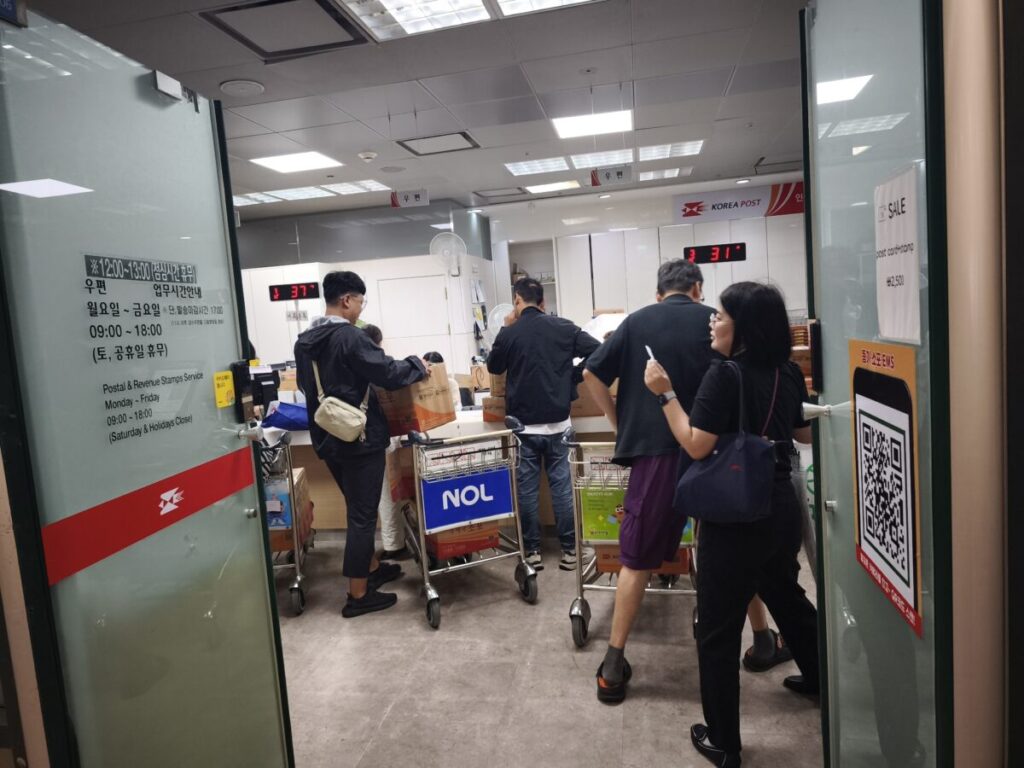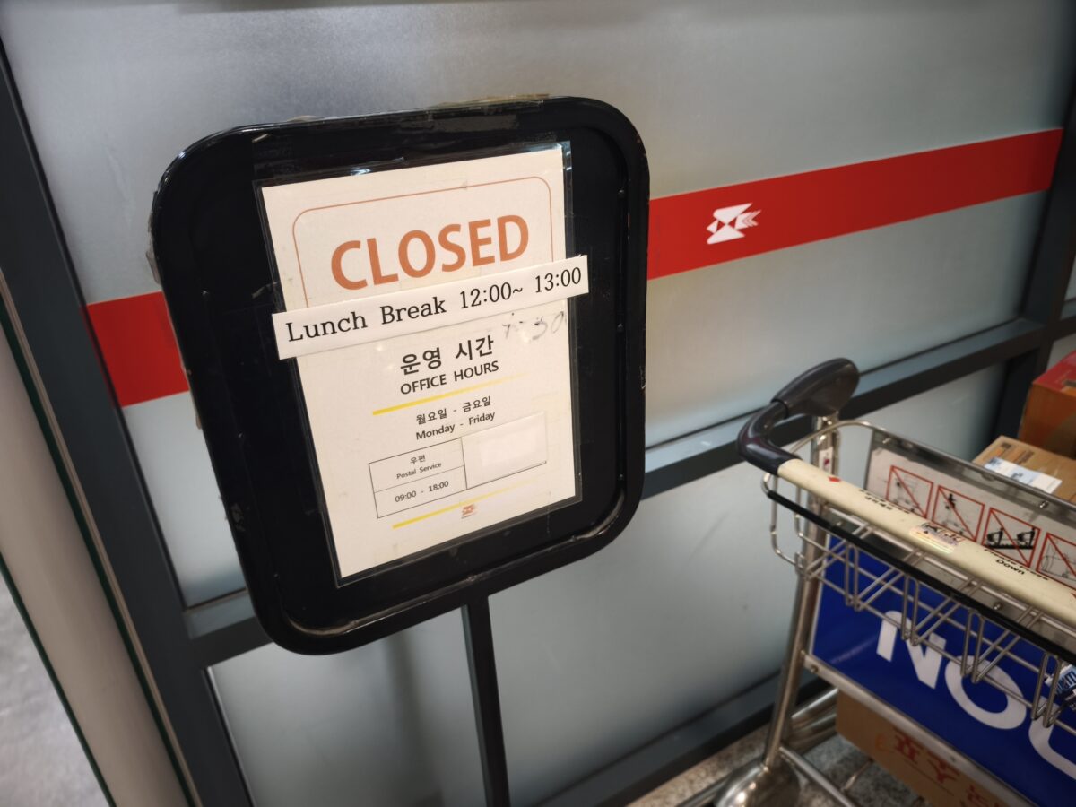 朝は9時から営業開始です。9時数分前に郵便局に行くと、数名の中国人?と、思われる人たちが、たくさんの小包をカートに入れてドアを開くのを待っている状態でした。