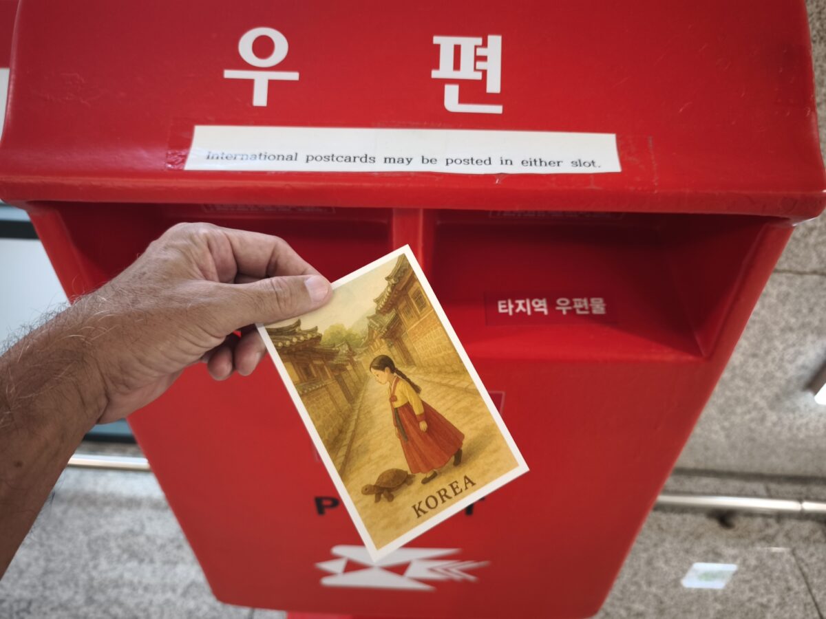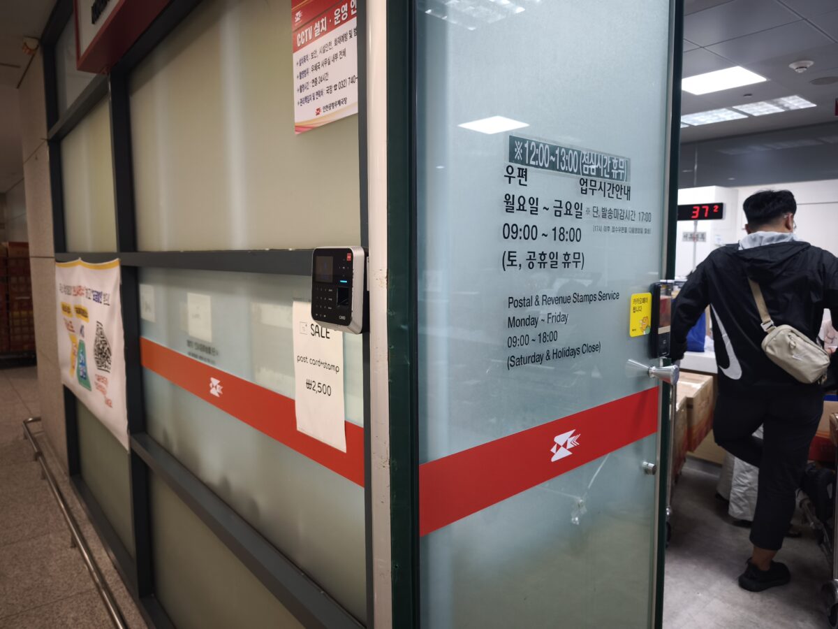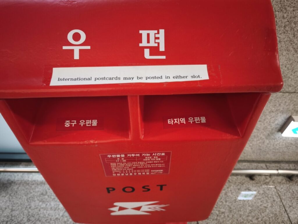 順番が回ってきて、日本、アメリカに絵葉書を送りたいので、その分の切手を4枚くださいとお願いした所、500ウォン切手を4枚売ってくれました。約 53円です。日本から、韓国への郵便料金は100円ですので、ほぼ半値ですね。しかも、日本国内のハガキの送料は85円なので、この安さにはびっくりしました。