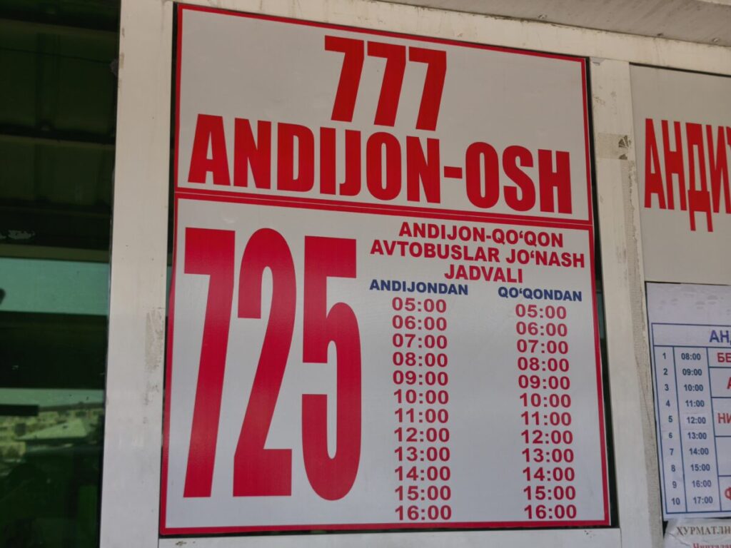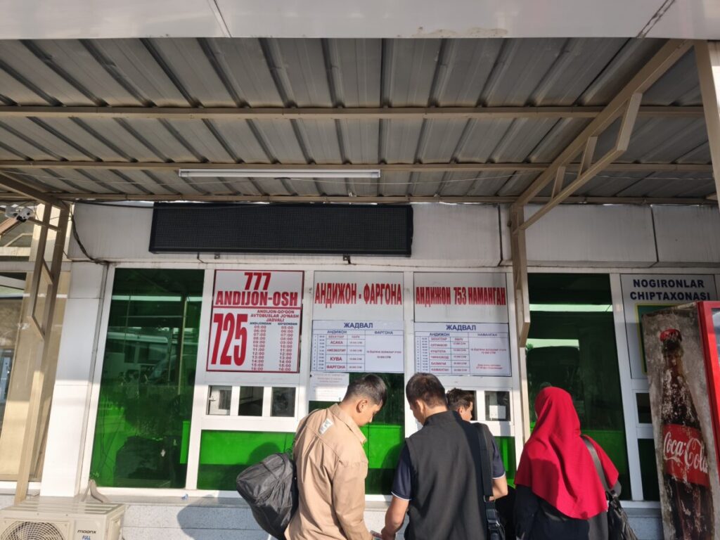 下見に訪れた際には、オシュ行きのマルシルートカがターミナルの一番端に停車していました。また、切符売り場のような場所には、777番のアンディジャン・オシュ の看板が掲げられていました。