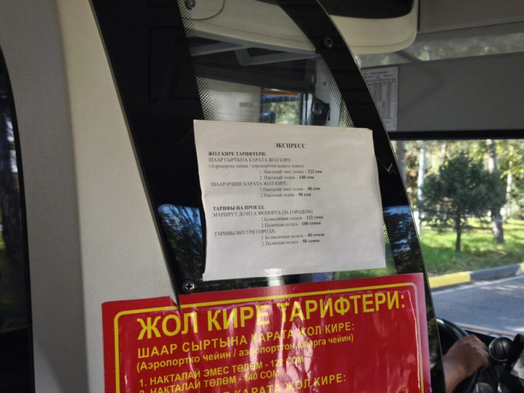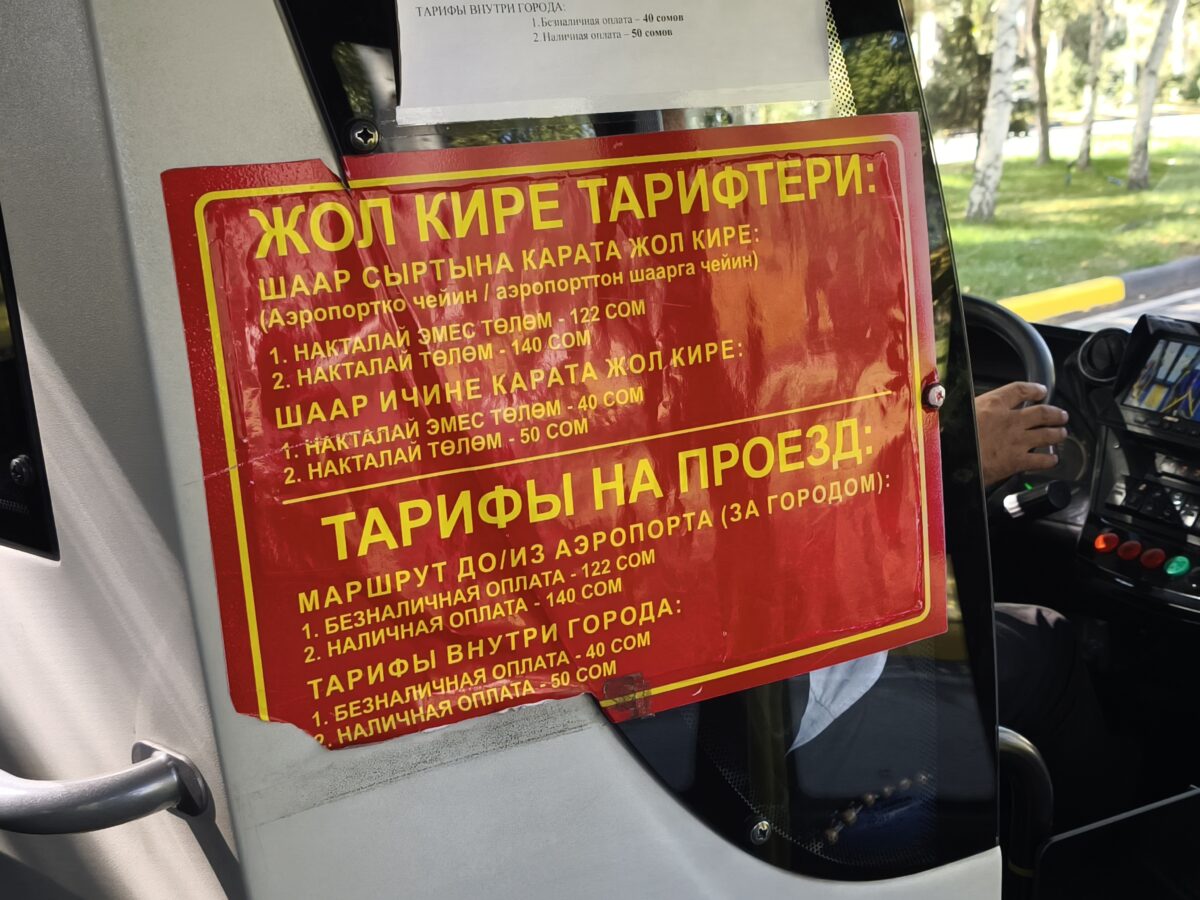 公共料金はかなり安いキルギスで、140ソムは高いなぁと思ったら、料金表が掲示されていて、空港からは140ソムだけど、それ以外の場所からの乗車は 50 ソム(約 90円)と掲示されていました。空港利用者は高い料金を支払わなければならないようです。