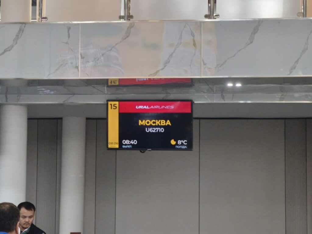 出発時刻などを表示する掲示板は、国内外共用でした。国際線の行く先を見てみると、モスクワ、サンクトペテルブルク、エカテリンブルグ、イースタンブール、ジュッダ、クェート等の地名が読み取れました。