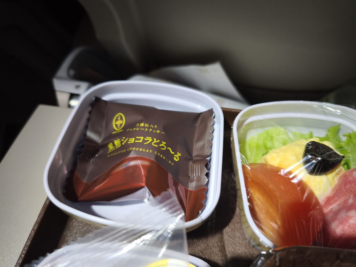 17:00頃に、パンとペットボトルの配布がありました。搭乗カウンターに受け取りに行くと、当条件に、「M」と印をつけていました。おそらくMealのMだと思います。
