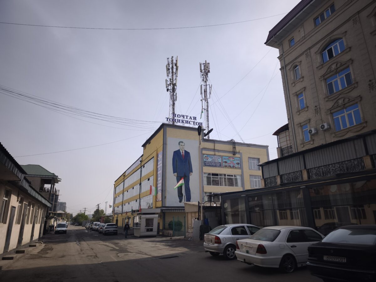 Googleマップを頼りに、郵便局へ向かうと、建物の上に、通信用の大きなアンテナが建っていたので、これが郵便局の建物であることがすぐに分かりました。さらに、タジキスタンの大統領である「エモマリ・ラフモン大統領」の全身の絵が壁に大きく描かれていました。