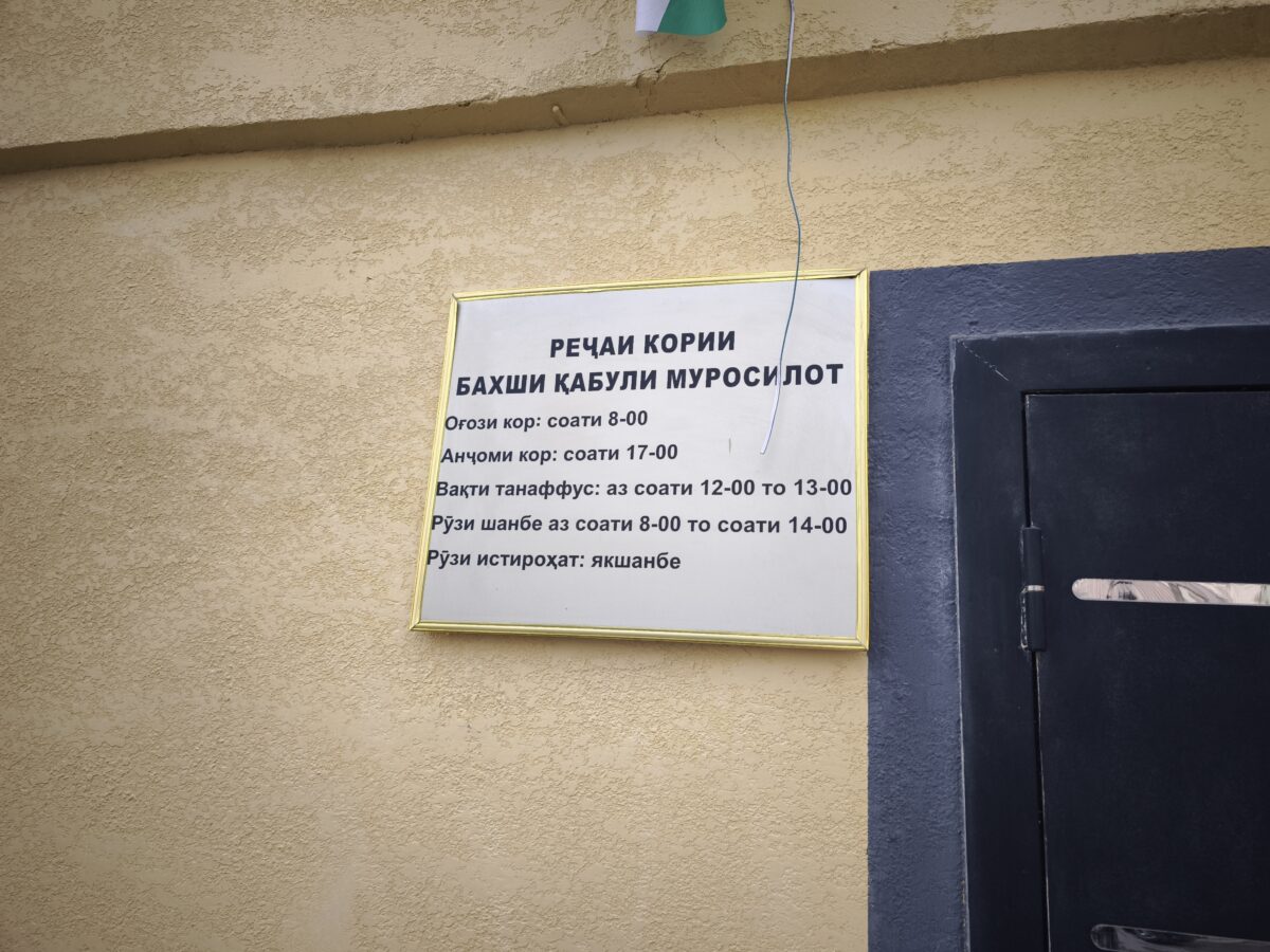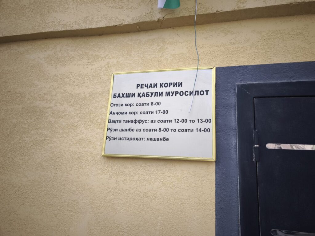 ドアの近くに、タジク語で書かれていますが郵便局の営業時間を示す掲示があり、Google翻訳で読んでみると、営業時間は「平日 8時~17時 / 土曜日 8時~14時 / 日曜日:お休み 昼休み 12時~13時」と、記載されていました。