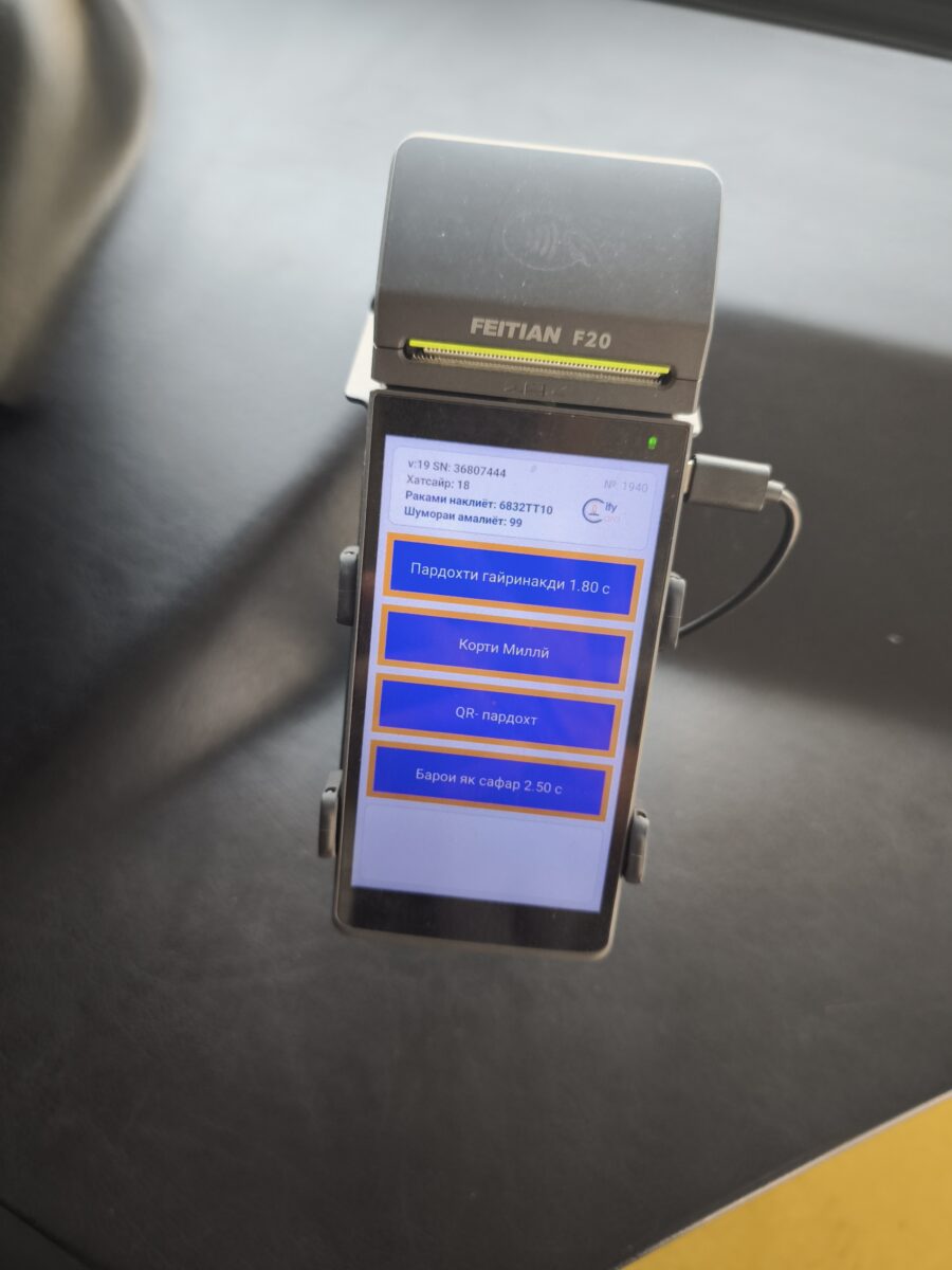 青色で示されたメニュー、上から「非現金カード払い 1.8 C」 「シティー・カード」「QR決済」 「 1回あたり 2.5 C(現金?)」です。上から2番めの「Корти шаҳрӣ (シティー・カード)」をタップして、カード端末にかざすと、ピッ という音して、支払い終了です。