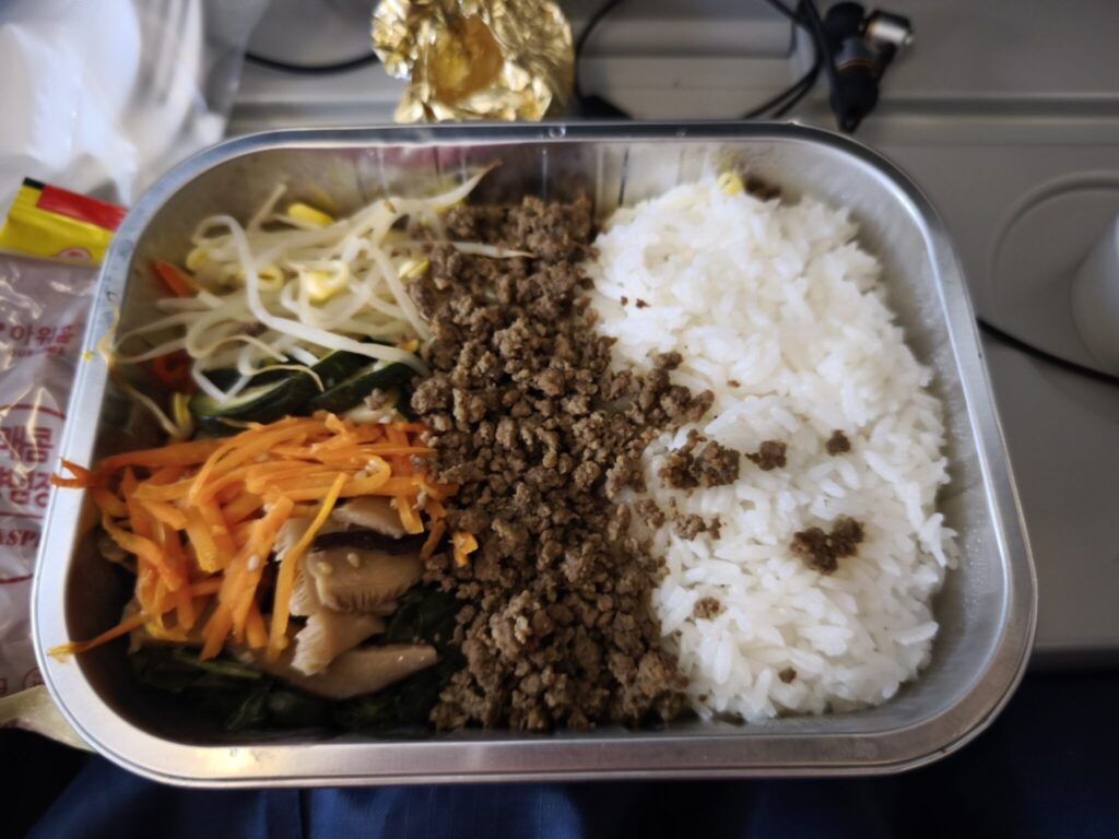 2回めの食事は、韓国到着まであと二時間ほどという頃合い、日本上空に差し掛かるところでした。まさか、2回目の機内食があると思っていなかったので、最初は、飲み物を配っているのかと思いました。