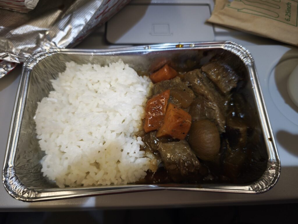 2回めの機内食も、「ビーフ」と「???」の2つから選択でした。ビーフとした聞き取れなかったので、もう一つはどのようなメニューなのかはわかりませんでした。