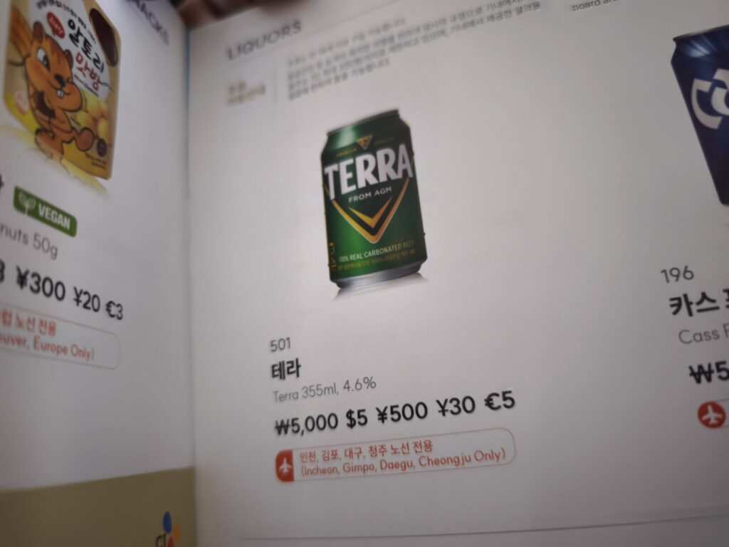 機内販売のビールは「TERRA 」と、「CASA」という銘柄が販売されていました。