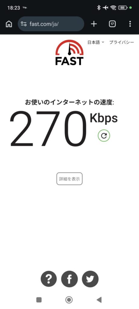 ネット接続スピードが 300kbps程ですので、テキスト中心のWebサイト閲覧、SNSの文字投稿、LINEのメッセージやり取りは可能ですが、高画質動画や大容量データのダウンロードは困難という状況です。