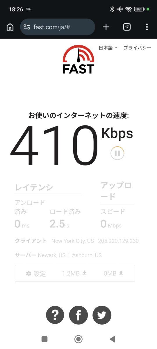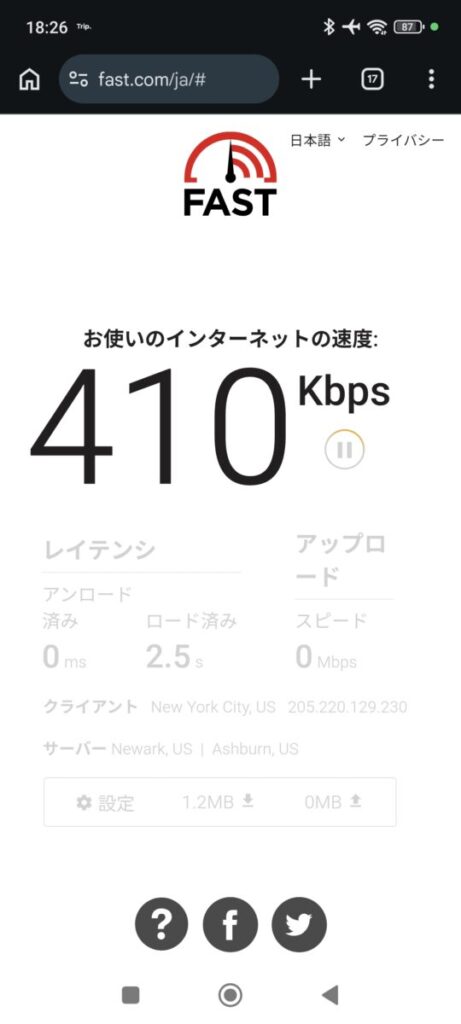せっかくなので、どの程度のスピードが出るのかをチェックしてみました。結果は、270~410Kbps でした。